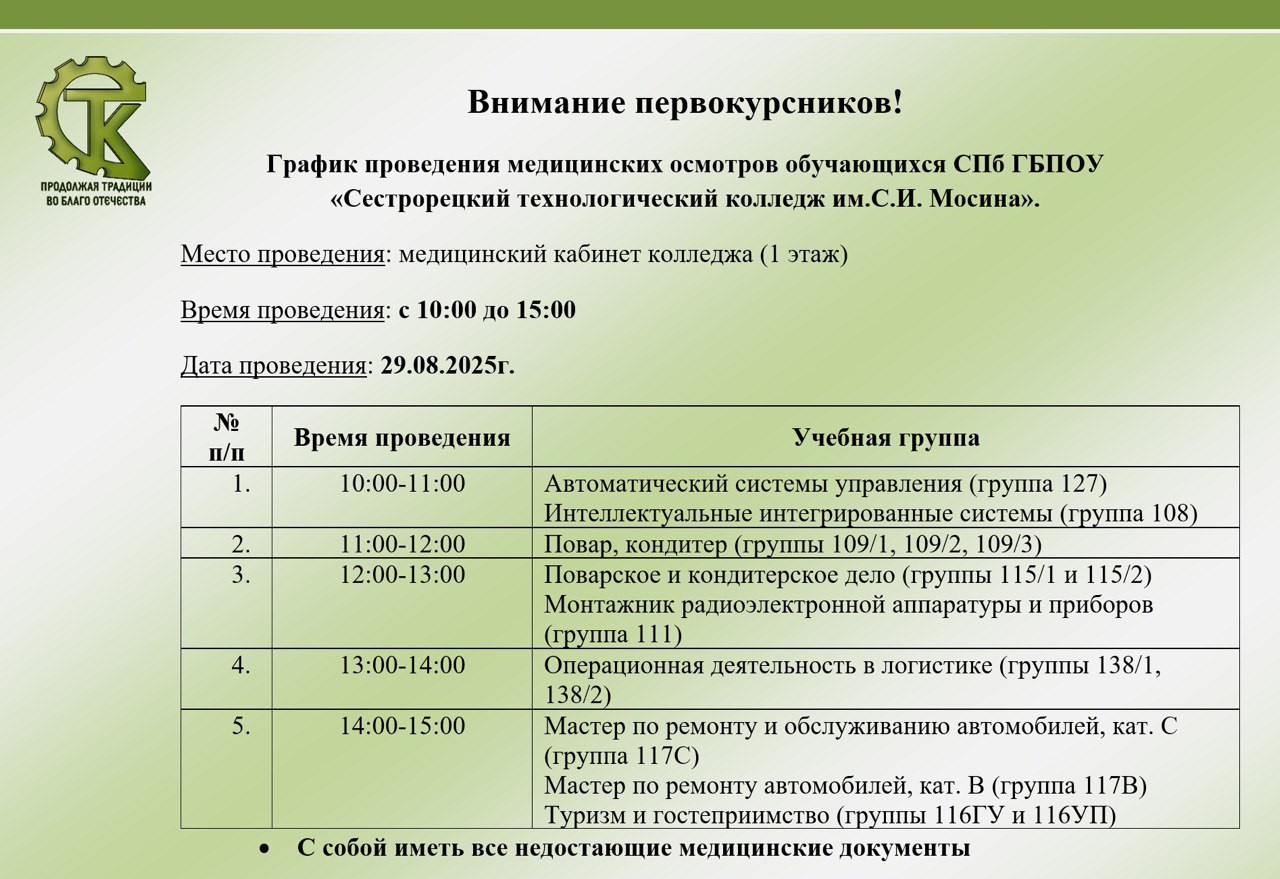 В СПб ГБПОУ ""СТК им. С.И. Мосина" для поступающих общежития не предоставляется. Зачисление в колледж осуществляется без вступительных экзаменов